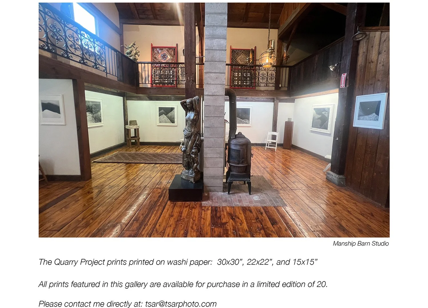 Given the emotional and contemplative nature of my work, the physical print has become an integral part of my creative process. For the quarry work, I printed on washi paper. The tactile quality and deep tonal range of washi provides a compelling depth and texture to the images, inviting viewers to spend more time with them. I chose to float the quarry prints against a white board and within a white frame to emphasize the ephemeral nature of the quarry images. This quality is enhanced by the slight rippling effect of the framed organic washi prints, which is a natural response to the environment, adding to the “paper as object” intent.